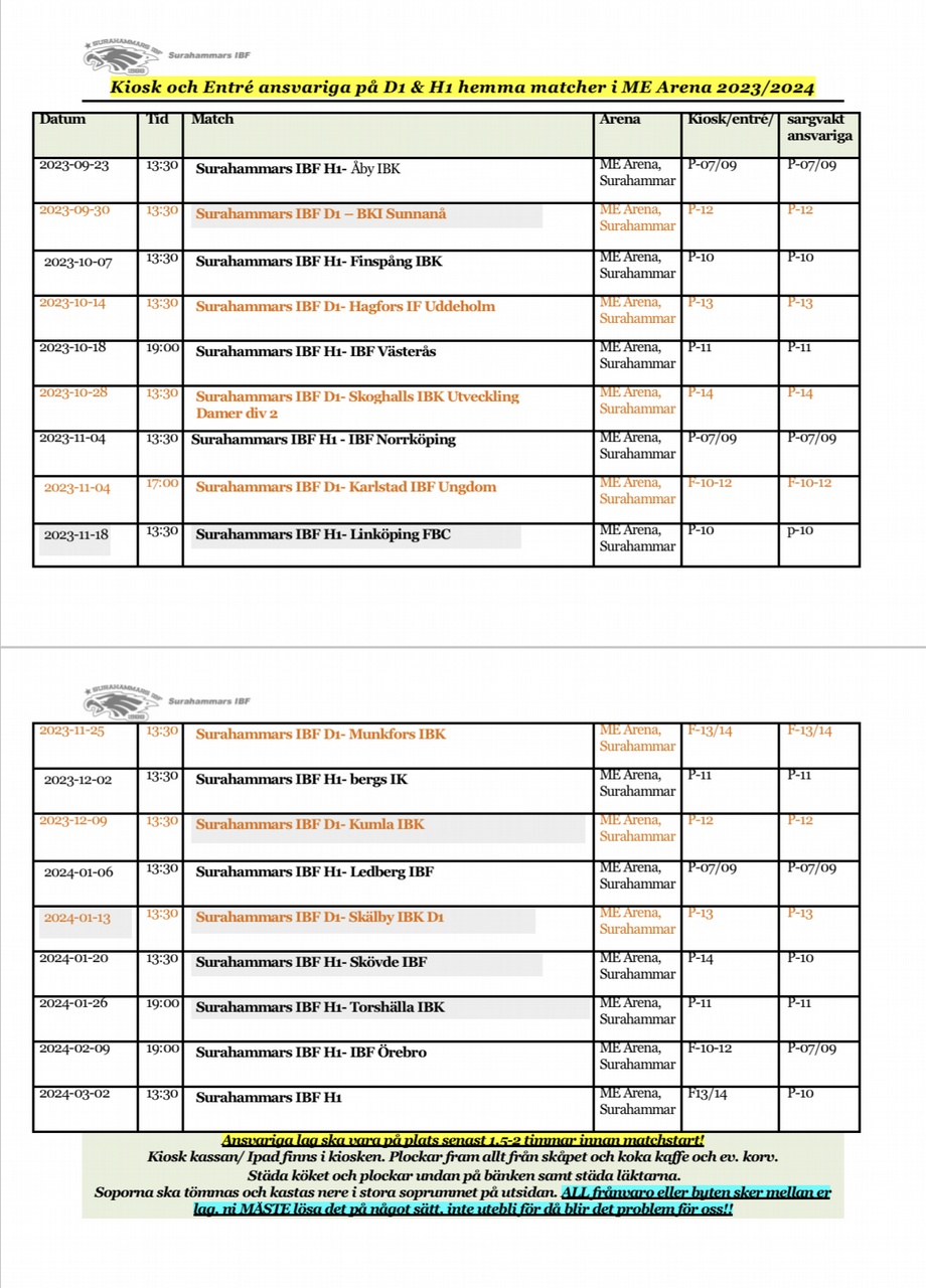 Kiosk/ entrè & sargvaktsschema på D1 & H1 hemma matcher.