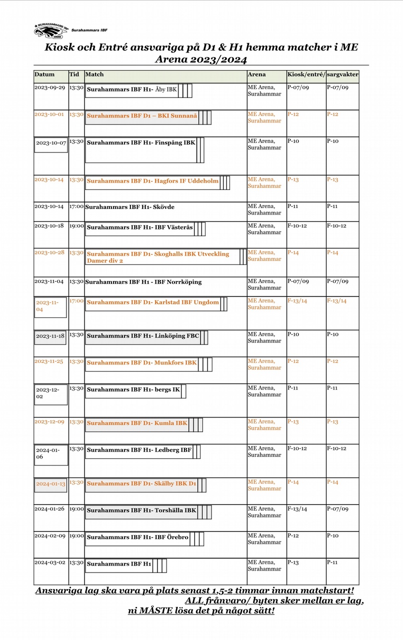 OBS! Uppdaterat kiosk/ entrè/ sargvakts schema på D1 & H1 resterande matcher 2024