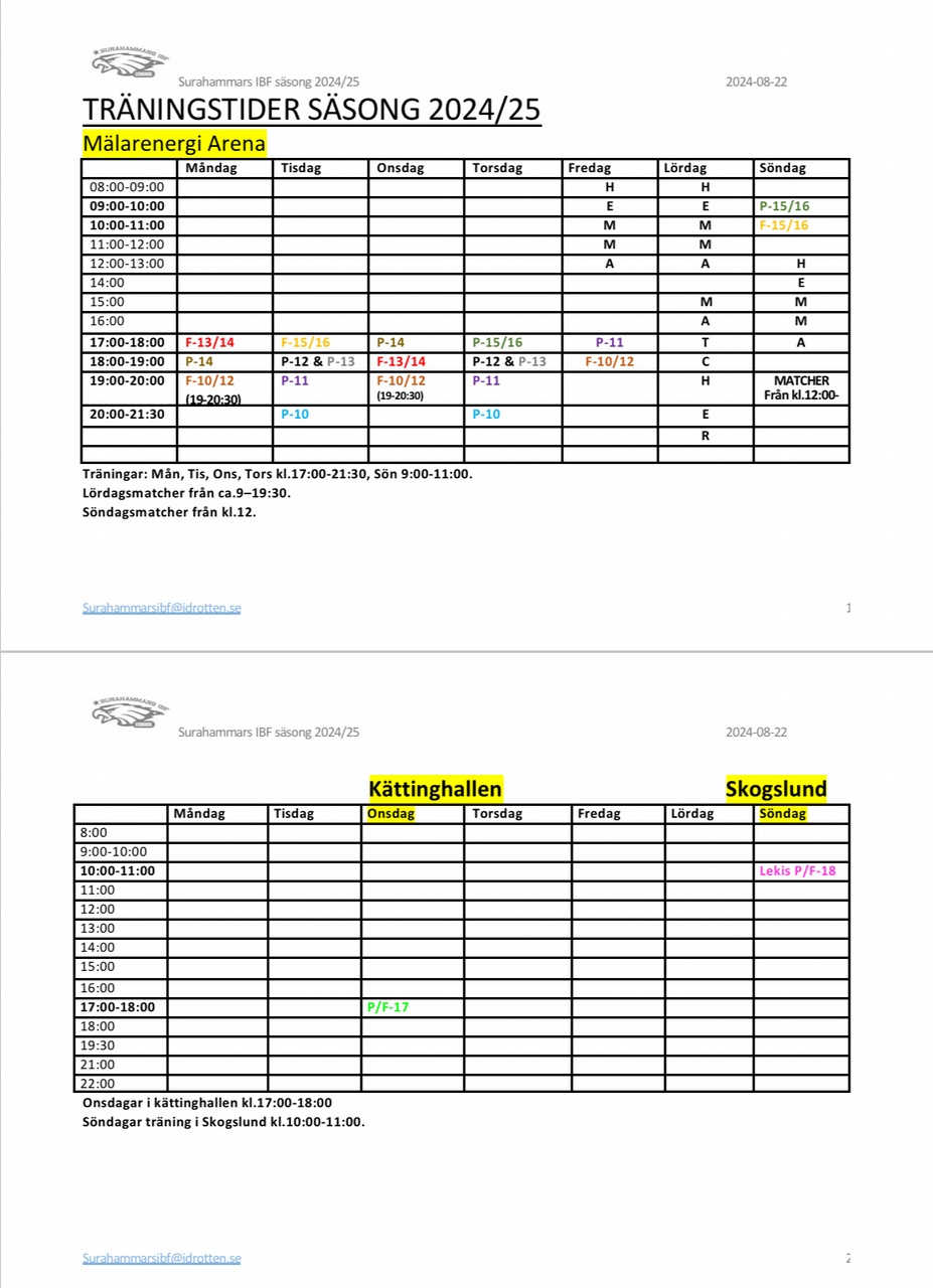 Uppdaterat träningsschema 2024/25