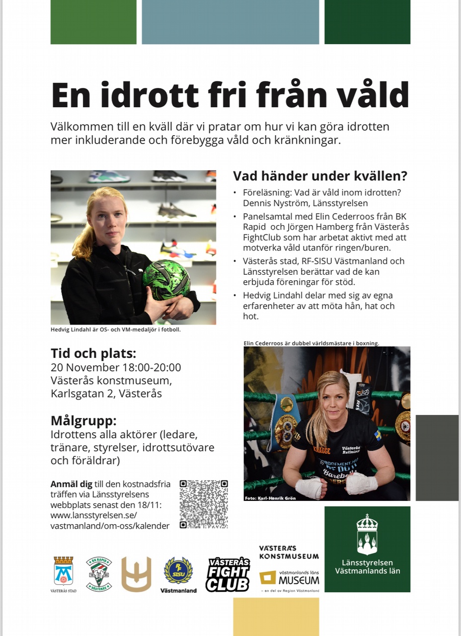 Vi bjuder in dig till en viktig och engagerande kväll onsdag 20/11 kl 18-20 i Västerås, där vi tillsammans pratar om hur vi kan göra idrotten mer inkluderande och förebygga våld och kränkningar.