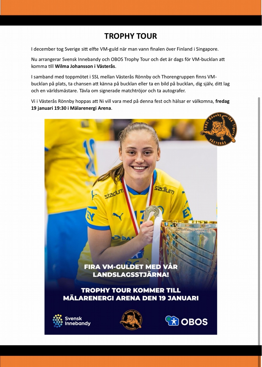 Hej, vi hoppas att ni har sett att VM-bucklan kommer till Mälarenergi Arena på fredag. Förutom VM-bucklan finns även andra aktiviteter såsom speedshooting och Tigerns pysselhörna på plats i hallen. Så kul att kunna fylla arenan med västmanländska spelare :)